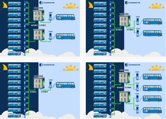 公交充電站為了降低公交運營成本,一般采用夜間小功率慢速充電,白天大功率快速補電的運營模式。夜間慢速充電充分利用8~10h左右的低谷電價,降低運營成本。白天大功率零星補電,滿足公交車排班需求。